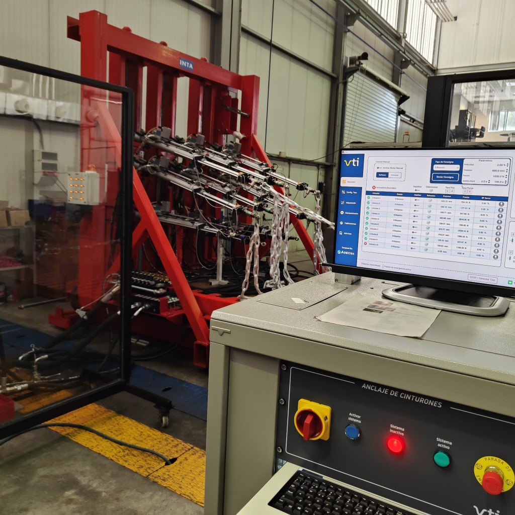Diseño y puesta en marcha de un controlador de 10 actuadores tanto en posición como en fuerza empleado como banco de ensayo para homologación de anclaje de cinturones. El control permite adquirir y controlar individualmente cada uno de los actuadores a una frecuencia de 1Khz pudiendo realizar cargas de más de 25 kN en menos de 2 segundos.